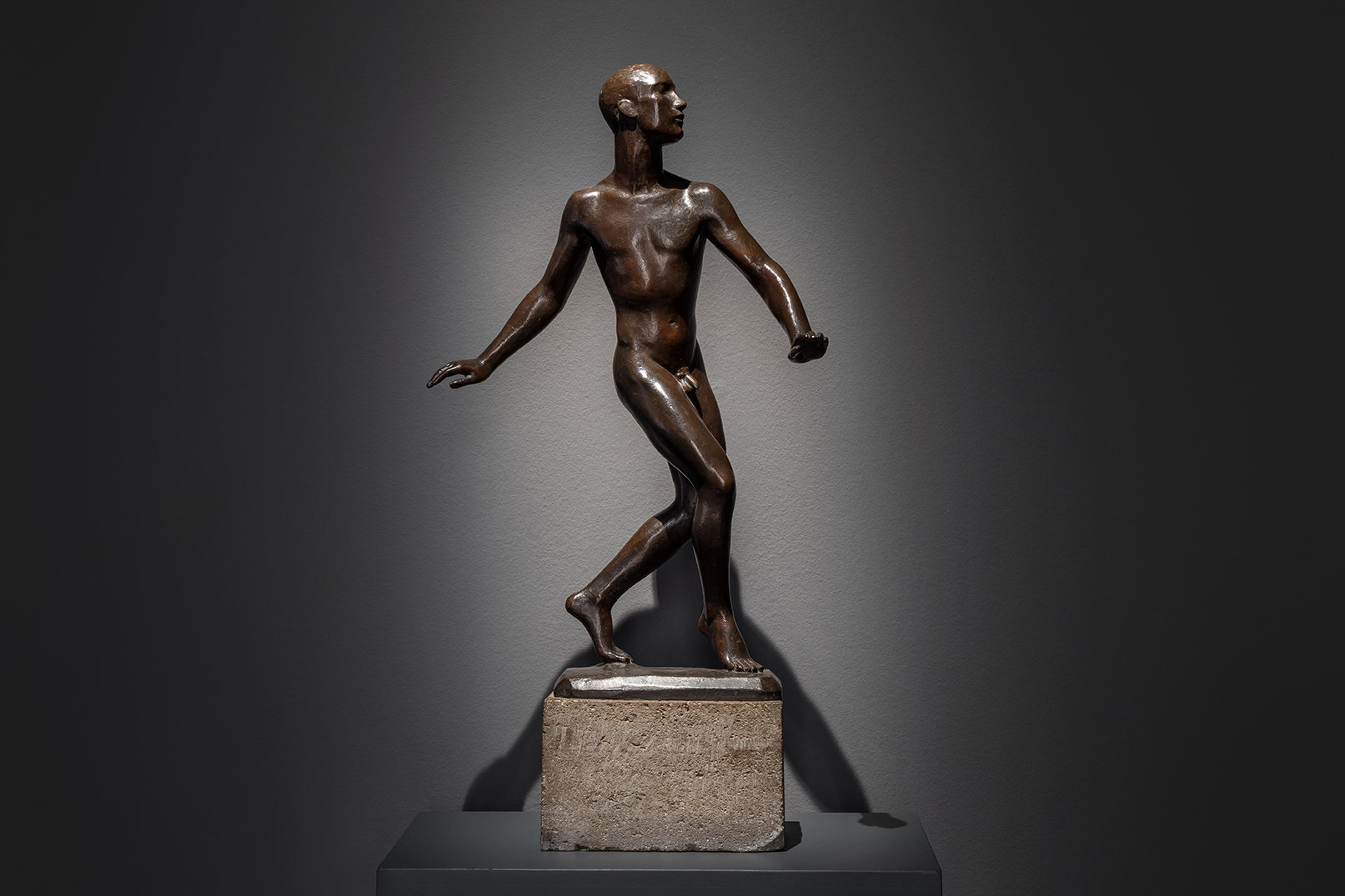 Im abgedunkelten schwarzen Kabinett treffen sie aufeinander: Nijinsky und Béjart. Der eine, unbestrittener Jahrhunderttänzer, erstrahlt, eingehüllt von punktgenauem Licht, dezent als jene berühmte Plastik, die Georg Kolbe (1877-1947) zwischen 1913 und 1919 nach Sitzungen des legendären Tänzers in seinem Atelier und wohl auch nach Fotos markanter Posen angefertigt hat. Den kleinen Raum nimmt indes eine Leinwand ein, auf der in Endlosschleife Maurice Béjarts maßstabsetzende Tanzversion von Namensvetter Ravels „Boléro“ zu sehen ist, die er 1961 für sein Ballet du XXe siècle in Brüssel schuf. Solist auf dem riesigen roten Tisch ist der Argentinier Jorge Donn, Lebensgefährte des Choreografen und bis zu seinem frühen Tod 1992 Protagonist zahlreicher Kreationen des Meisters totalen Theaters. Jorge Donns Interpretation jenes erotischen Symbols, das, seine rein männliche Umgebung in den Sog des Sexus mitreißend, tanzend verglüht, hat Bestand bis heute gegenüber allen Nachfolger*innen im Solo. Ebenso prägend sind Béjarts bis in die Gegenwart nachwirkende Verdienste allgemein um den männlichen Tanz.