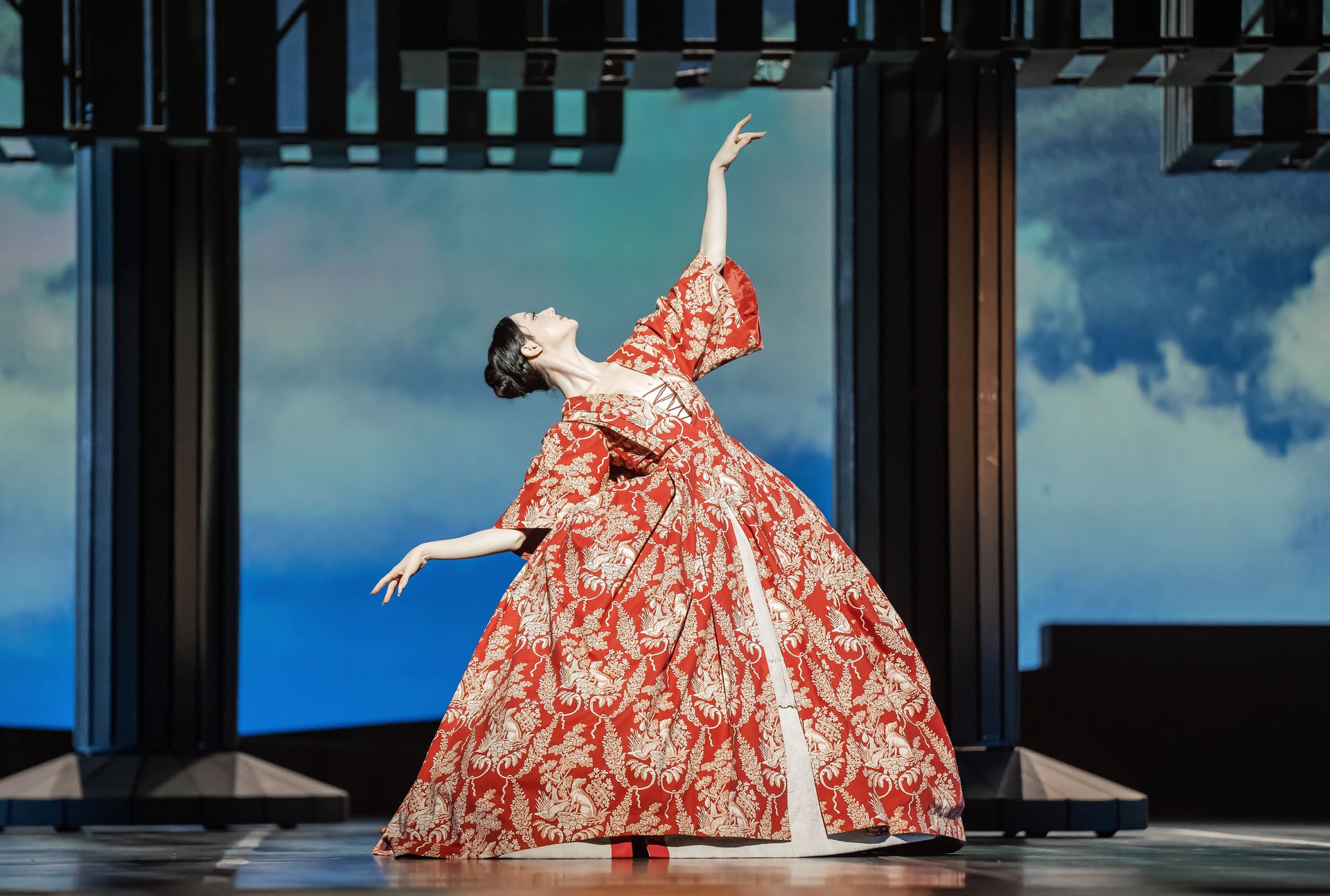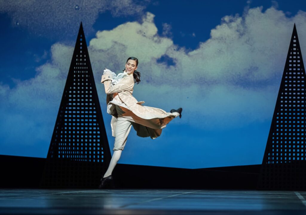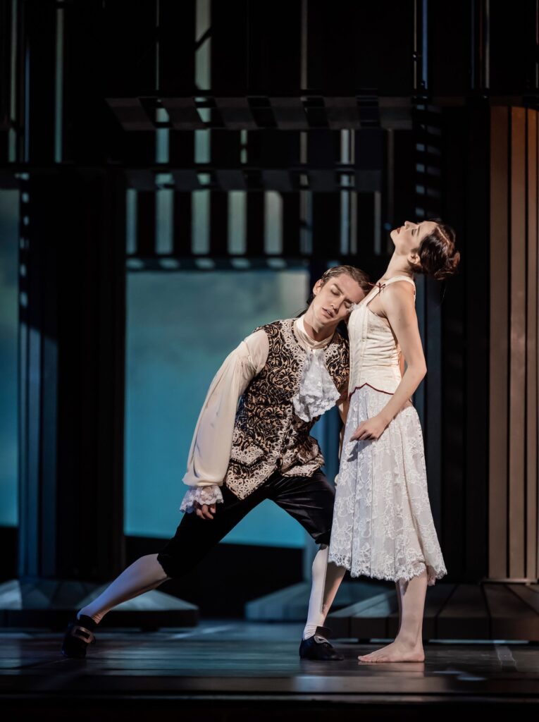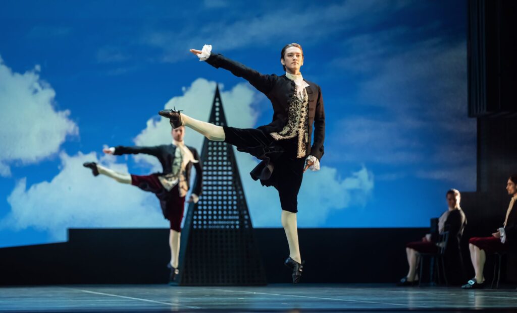 Zu Mozarts Adagio und Fuge in c-moll wird zu Beginn über die Bühne geschritten. Tänzerinnen und Tänzer in Rock, Weste und Kniebundhose (Kostüme: Hervé Pierre) scannen ihre wechselnden Gegenüber mit Blicken, während sie vor einem stimmungsvoll bewölkten Hintergrund umeinander her flanieren. Irgendwann stellt Margarita Fernandes ihren Gartenstuhl mit lautem Nachdruck in der Mitte ab. Es ist die subtile Aufforderung zu einem Spiel, bei dem sich die Geschlechter übermütig-frech, von sich selbst überzeugt und auch leicht frivol Schritt für Schritt näher kommen sollen. Schnell stimmen alle ein, wobei zwei von Fernandes’ Kolleginnen die Aufmerksamkeit durch das Ausbleiben des Aufsetz-Geräuschs des Stuhls auf sich lenken. Ein für jene Epoche typischer Schachzug ist das, in der Preljocaj sein Ballett atmosphärisch, modisch, inhaltlich, stilistisch, gesellschaftlich und philosophisch angesiedelt hat: in der Ära intellektuellen Einfallsreichtums.